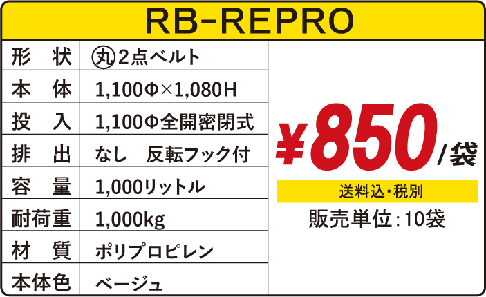 - 1,000kg以下の原料、製品、紛体物、廃棄物の搬送・保管が可能です。リレーバッグ(通称:フレコンバッグ)REPROは、分別・収集・運搬に最適で丈夫な袋です。